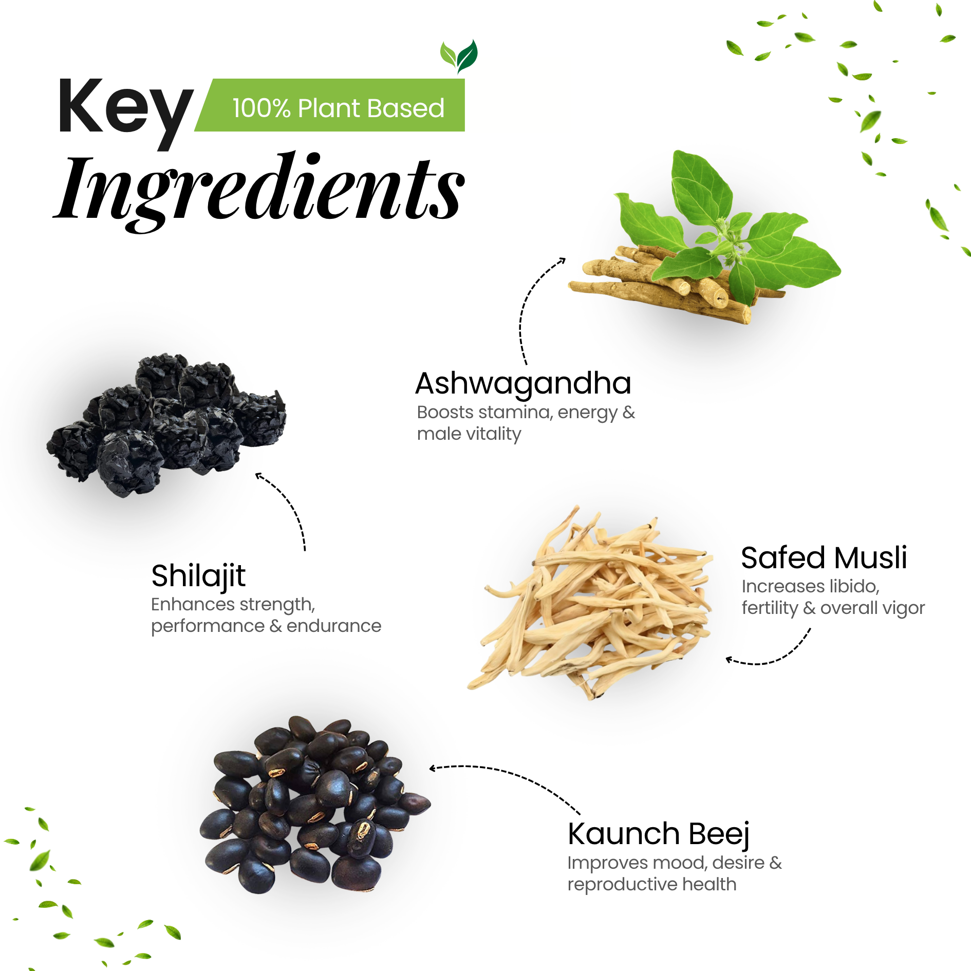 Bold-X में शामिल हैं – कौंच बीज, अश्वगंधा, सफेद मूसली, गोक्षुर, अकरकरा, जायफल, जावित्री, विदारीकंद, इलायची और क्रिस्टल शुगर। सभी हर्ब्स शुद्ध और पारंपरिक रूप से इस्तेमाल किए जाते हैं।
