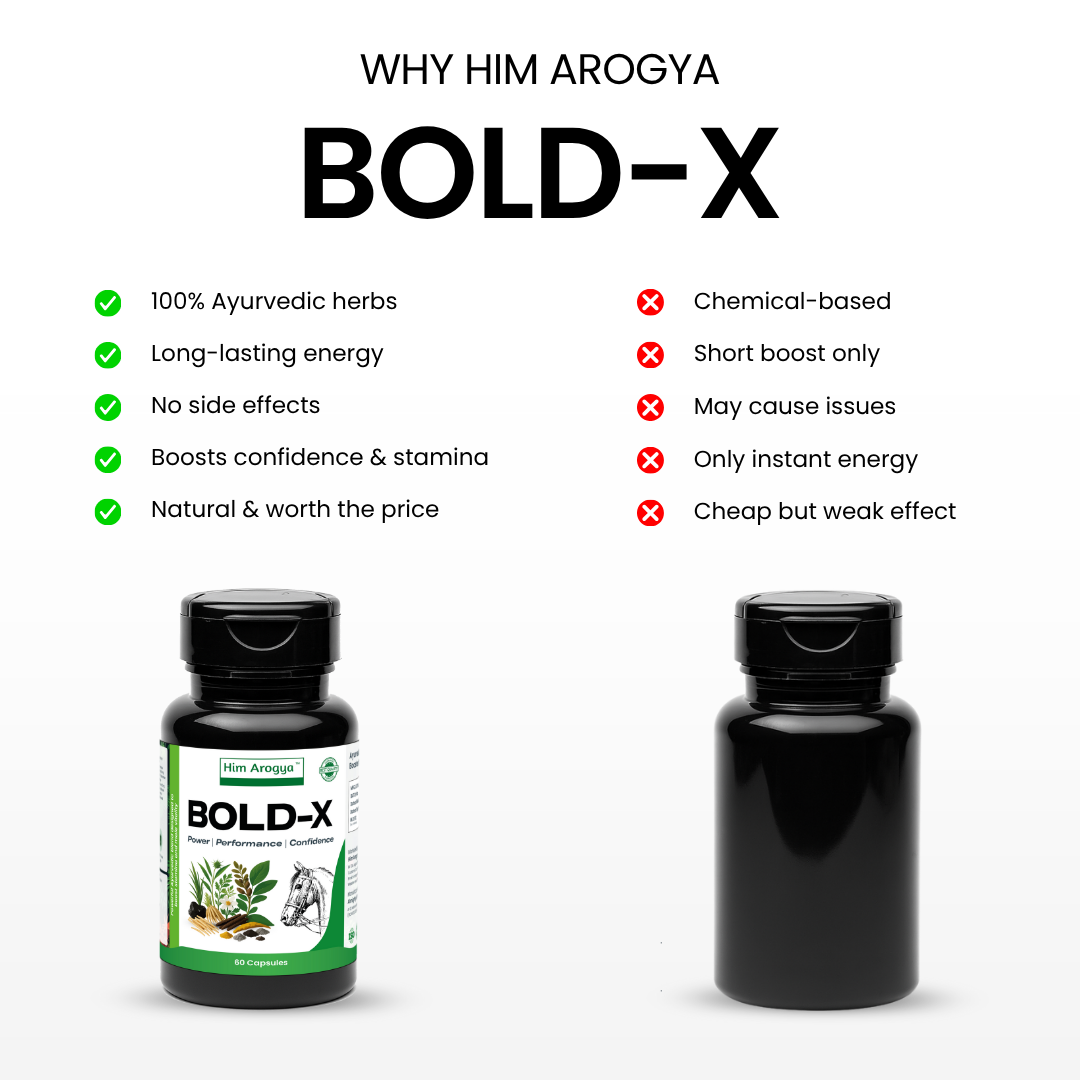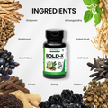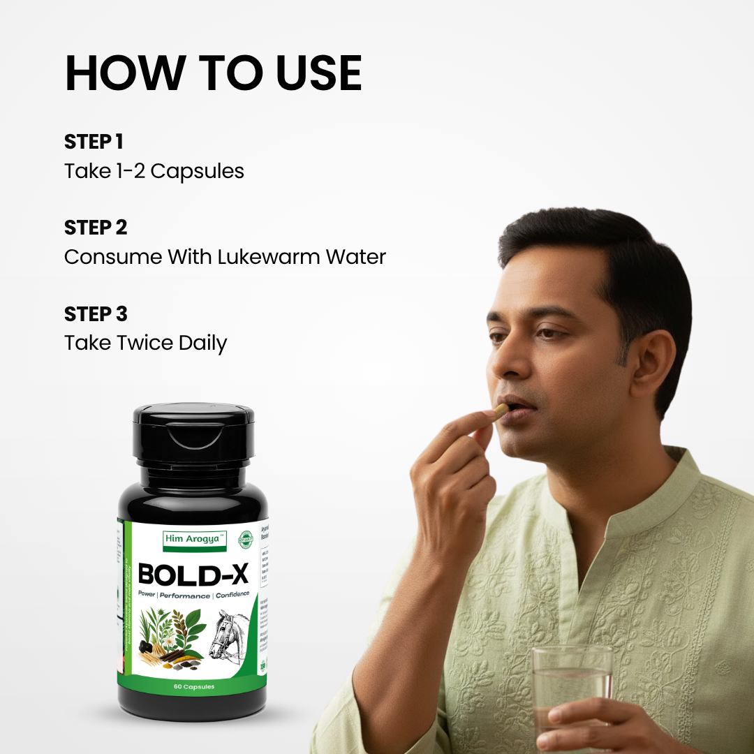 Bold-X में शामिल हैं – कौंच बीज, अश्वगंधा, सफेद मूसली, गोक्षुर, अकरकरा, जायफल, जावित्री, विदारीकंद, इलायची और क्रिस्टल शुगर। सभी हर्ब्स शुद्ध और पारंपरिक रूप से इस्तेमाल किए जाते हैं।