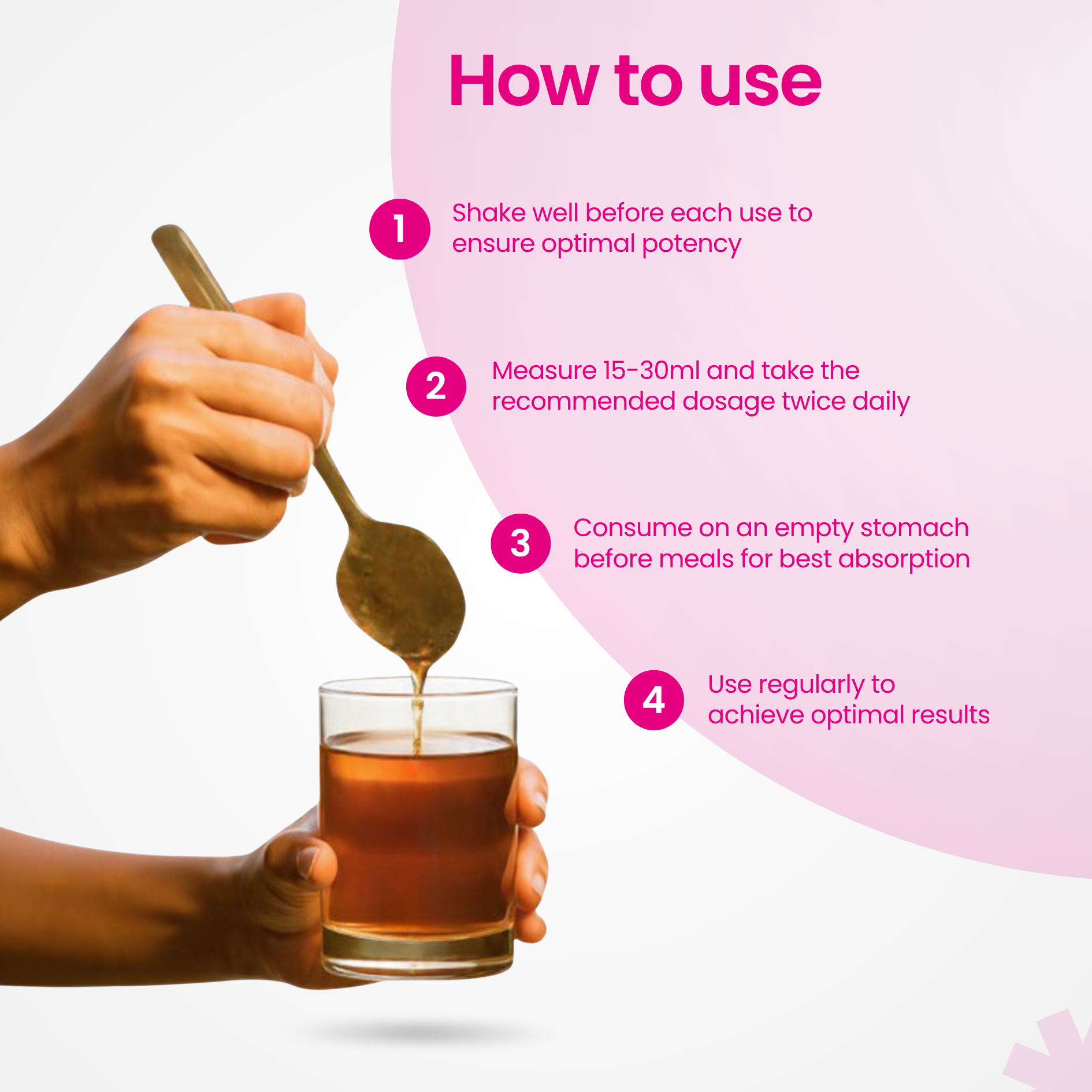 Take 20–30 ml twice daily — morning and evening — preferably on an empty stomach. Shake well before use.